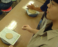2.形をつくる 手ろくろ用の台の上で成形します。台の上に直接土を載せると、あとではがれにくくなるので、新聞紙を敷いて、その上で成形します。丸めた土を中央に円状の板になるように押し付け、お皿の形になるように、指を使って形づくっていきます。 |