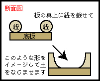 一段目の紐を載せる時、紐が底からはみ出さず、また内側にもいきすぎないよう、縁ぎりぎりの真上に載せます。また指で底と紐の土をなじませる時、図のような形になるようにします。この時、隙間がないようにしないと、あとでひび割れなどの原因になるので要注意。 |