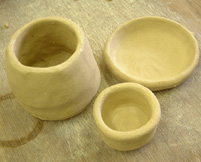 下の土と上の土をなじませる時には、親指を器の内側、人さし指を器の外側にすると、作業がしやすくなります。その際に人さし指で、外側の土を下から上に引き上げ、親指で内側の土を上から下になじませるようにするときれいに出来上がります。紐を積み上げて、なじませていくうちに、初心者は器が外側にふくらみがちです。広がりすぎないように気をつけましょう。 |