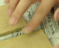 6.ドベをつける 底板と側面の板のそれぞれ接合する部分に、ドベを接着剤かわりにつけていきます。なるべく多めにドベをつけます。「ドベを塗る」というよりは「ドベをつける」という感覚で、ポンポンと指を動かしながらつけていきます。 ※ドベをつける様子の動画はこちら(2.76MB)→ |