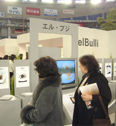 お料理番組でお馴染みの江上栄子さんは、有田の香蘭社がもつ約100年ほど前のデザイン帳を参考に表現した「染錦友禅菊」という器を用いたコーディネート。多くの人がその微妙な色彩に足を止めていました。押すな押すなの人垣で、一体どなたのコーナーかしらと覗いたのは、加藤タキさんのブース。気の合う友達とのお茶の時間をテーマとしてテーブルは、大人気でした。そんな中でやっと撮れた写真です。 このコーナーでは、今回特別展示として料理研究家としておなじみの服部幸應氏が紹介する「エルブシ」のコーナーもありました。「エルブジ」は現在世界で最も注目されているスペインのレストラン。料理界のダリまたはピカソと呼ばれるフェラン・アドリア氏が料理長を務めています。たくさんのお皿に少しづつサーブされるスタイルで、丸や四角と様々な形のお皿が使われています。その斬新な形や使い方に、しばし釘付けになります。いかにも業界の方というような人も、じっくりと鑑賞されていました。 |